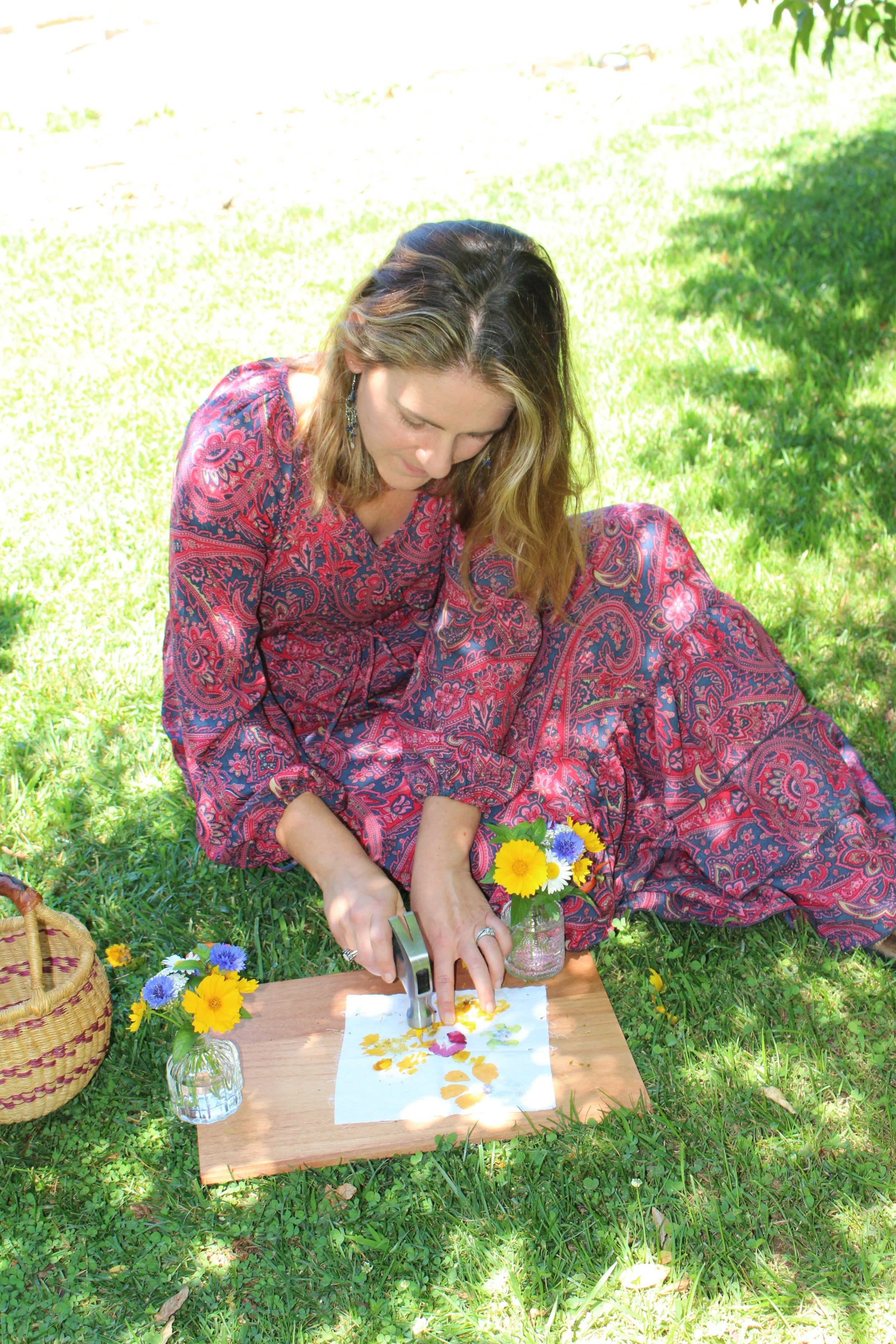 Alicia in her garden with handcrafted, flower-pounded scarf